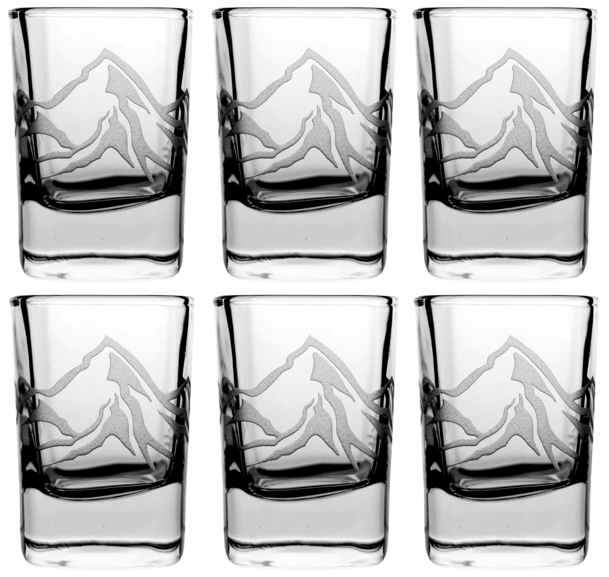 Komplet efektownych kieliszków do wódki o pojemności 50 ml zdobione grawerem z motywem gór. Eleganckie kieliszki o pojemności 50 ml przeznaczone do wódki.
